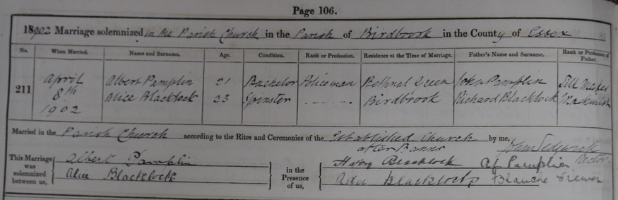 Above is a copy of the parish register for Albert Pamplin and Alice Blacklock's wedding on the 8th April 1902. Alice was the middle daughter of Harriet and Richard Blacklock, Richard by his first marriage to Hannah had four sons, William, Tom, Harry and Frank, and by Harriet three daughters Ada, Alice and Mary. Richard died in 1886 when she was just 8 years old. In 1889 Harriet became owner of The Plough and remained so until 1911. The following pictures record the events of the day.