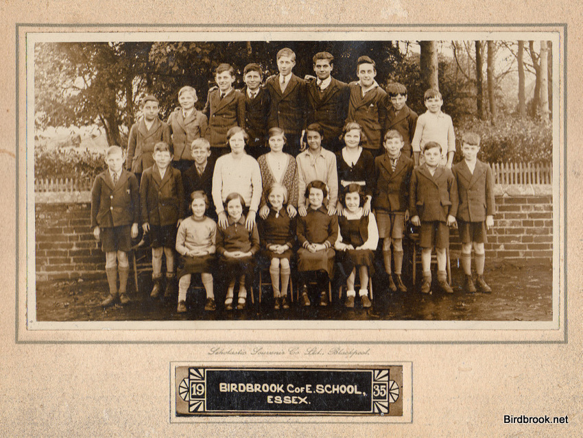 Birdbrook School, 1935, with the thanks to Mary Sare this picture has been passed around the village and we have now named several children. Back row: Bill Swallow, Jimmy Barnes, Don Kendall, Harold Blyth, Tommy Hayes, Jack Wallis, Toby Hunt, Percy Coote, Unknown. Middle Row: Unknown, John Coote, Unknown, Jean Coote, Unknown, Doreen Swallow, Unknown, Tim Ralling, Ted Wallis, Unknown. Front row: Unkown, Unknown, Unknown, Marjurie Coote, Maud Ray.