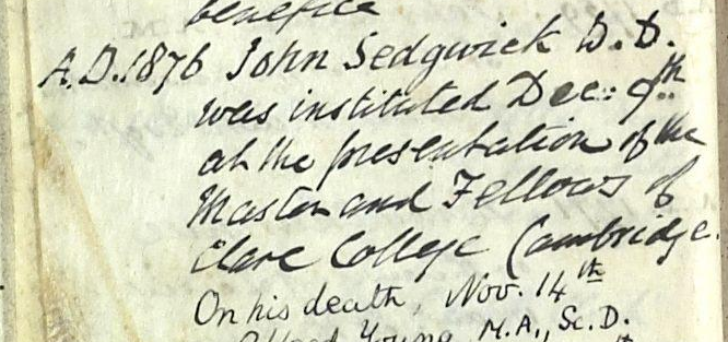 The above is Rev. Sedgwick's entry in the list of Rectors found in the front of the Parish Records and shows he was Rector from 9th December 1876 to his death on 14th November 1910.