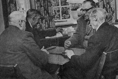 Other competing ideas, and the spread of TV, greater affluence, and the increasing number of cars have all widened the horizons of village living more than anyone would have guessed ten years ago. He thinks unlikely they would build another at the present time, even if the money was available. Just down the village street from Birdbrook's Community House stands the Parish church of St. Augustine, neat and tidy in its well-kept churchyard. Golden Surprise By a curious trick of fate, at about the same time as the community house was opened this tiny village had another golden surprise. When the widow of a former rector,Mrs. Edith Clara Young, died in a Cambridge nursing home, in October 1958, she left £77,588. The residue went to the rector and church-wardens of Birdbrook, where her husband Dr. Alfred Young had been incumbent from 1910-1940. | For the menfolk a friendly game of dominoes is popular. |