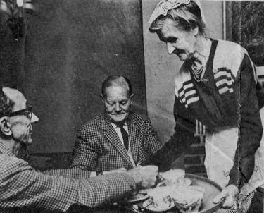 They felt it would be a fine thing if there could be a place in the village where everyone could meet. They wanted it to be like a club, to which everyone in the neighbourhood could belong, where they could walk in and out as they pleased, meet their friends and hold social events. So the community house was born. It opened just over eight years ago. Designed in traditional Essex style, with pargeted walls and a reed thatched roof, it stands near the old schoolroom in the village street, looking across the village pond. In front is a rose garden and at the back a fine bowling green. Inside there is a reading room, with all the latest magazines and newspapers, and a larger room for games and social events. The atmosphere is like that of a well-to-do club, with carpeted floors, central heating, TV, and furnishings which would do credit to a high-class hotel. There is a radio and record player, and there are no formalities, no subscriptions, nothing to pay. | Mrs. Emily Hayes serves tea and biscuits at the community house. |