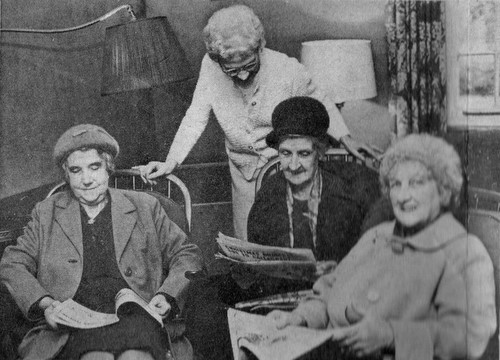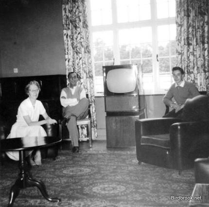1958/59 inside the main room of the 'new' community house, Mr & Mrs Burgess the first caretakers. Look at the size of the telly! | Inside the kitchen, Mr & Mrs Burgess and reading the book Fred Taylor who lived in Halfway Cottages. Pictures by David James. |
